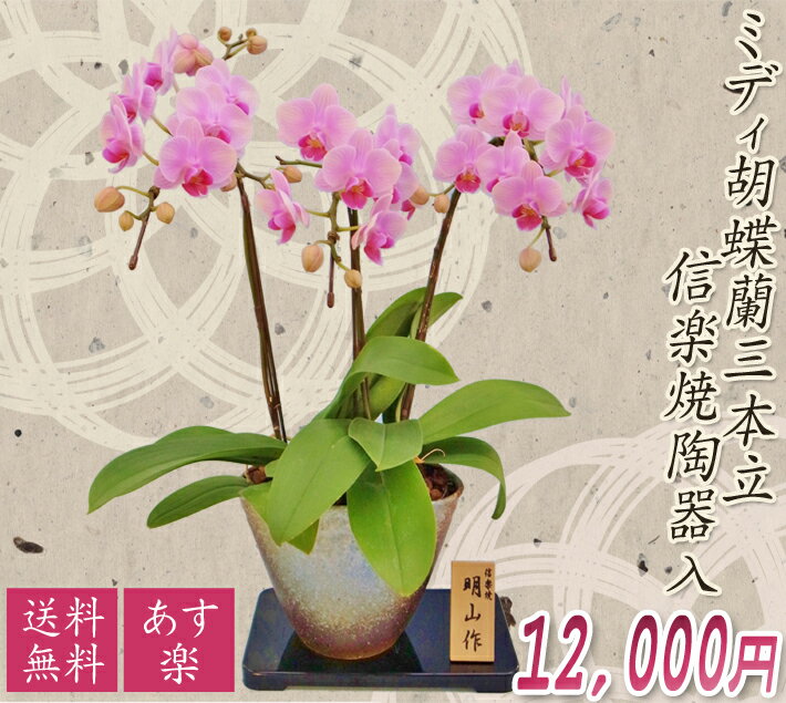 ギフト対応 商品詳細 商品名 ミディ胡蝶蘭3本立信楽焼き陶器入り サイズ 高さ約55cm前後 輪数18輪〜 花径約5.5cm ※植物の為、個体差があります。
