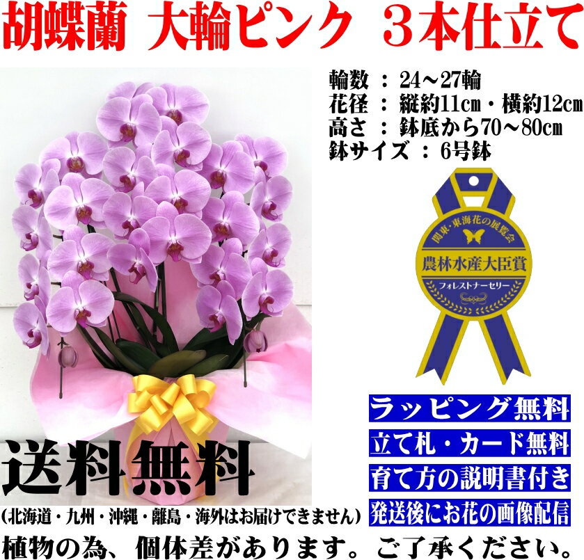 胡蝶蘭大輪 ピンク3本仕立て 植物の為、個体差があります。